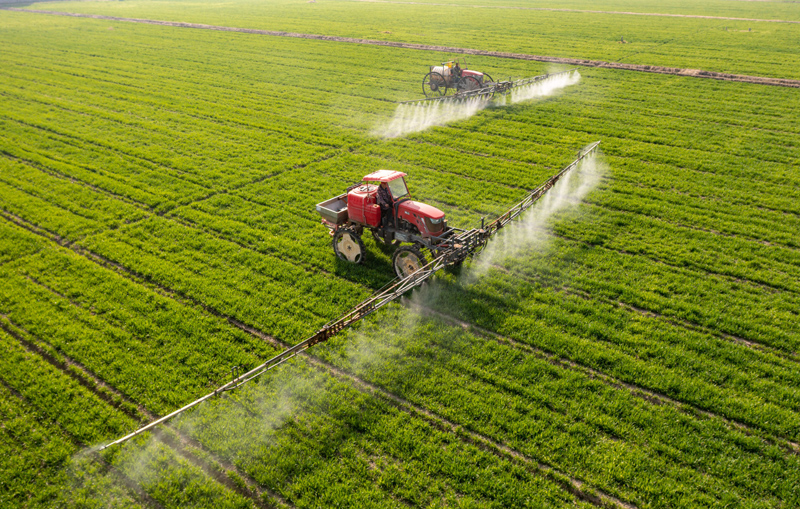 2022年3月9日,在江苏省海安市大公镇贲集村,村民驾驶植保机械在小麦田间进行喷洒药物作业(无人机照片)。新华社发(翟慧勇 摄)