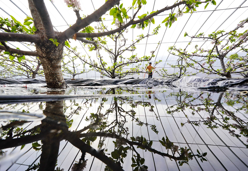 2022年1月11日,河北省滦州市茨榆坨镇建民种植专业合作社的一名社员在大棚内给樱桃树浇水。新华社记者 杨世尧 摄