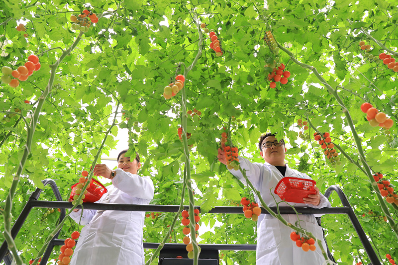 2022年2月18日,湖南省东安县华维节水公司智慧农业大棚内,员工们采摘圣女果准备上市。新华社发(严洁 摄)