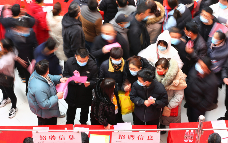 2022年2月19日,求职人员在山东省滕州市“春风送岗”春季人才招聘会上寻找就业岗位。新华社发(李志军 摄)