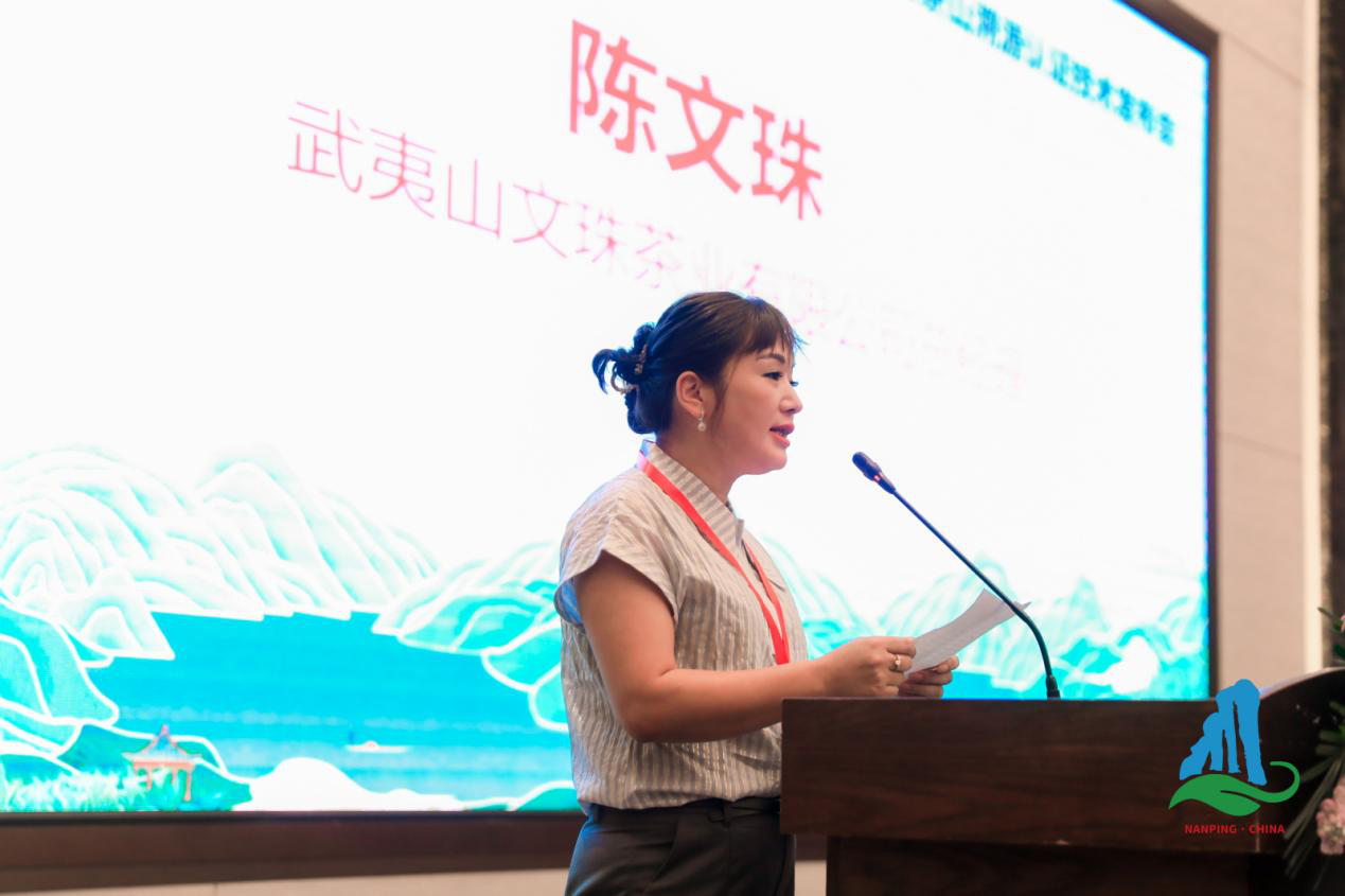 (送样茶企代表武夷山文珠茶业有限公司总经理陈文珠上台发言)