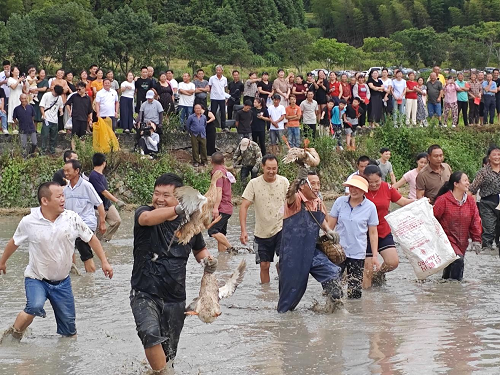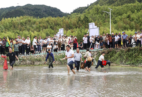 活动现场设置多个农事趣味体验区,吸引众多游客和农户积极参与。抓鱼摸田螺体验区,人们欢声笑语,尽情享受抓鱼、摸田螺的乐趣,收获满满的鱼和田螺。抓鸭子比赛现场气氛紧张刺激,游客和农户们纷纷展现自己的身手,争夺鸭子。在割稻谷体验区,游客和群众亲自下田,感受农耕生活的辛苦与乐趣。“万担粮”挑粮接力比赛紧张激烈,各参赛队伍齐心协力,争夺胜利。地瓜收获体验区,大家挖地瓜,体验农产品收获的喜悦。此外,体验网红打卡区也吸引众多嘉宾、游客和群众前来打卡,留下美好的回忆。