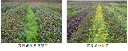 每年10-11月,在水资源丰富或具有灌溉条件的茶园,适宜播种紫云英绿肥,也可选择绿肥油菜,与基肥混匀撒施于茶园;在水资源欠缺茶园,适宜播种耐旱性较强的苕子。第二年3-4月,茶树春梢前刈割,将绿肥翻压入园;也可覆盖茶园土壤表面,保温包墒,减少水分蒸发。每年5-9月份,茶园可选择拉巴豆、硬皮豆、印度豇豆等夏季绿肥种植;也可实行自然生草,以匍匐型、浅根系生草为主,包括苕子、阔叶丰花草、小蓬草、马唐、火炭母、藿香蓟、竹节草、毛蕨、白车轴草及菟丝子等。
