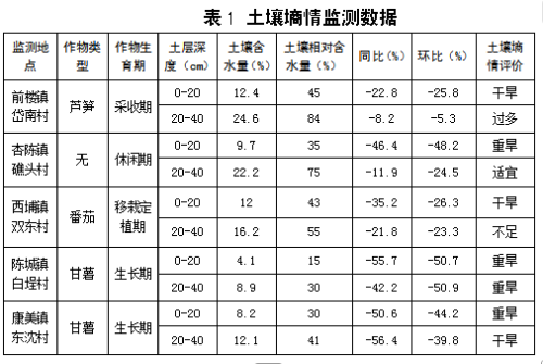 全县5个监测点平均结果为:0-20cm土壤含水量平均为9.3%,相对含水量平均为33.4%,环比下降37.8%,同比下降40.9%;20-40cm土壤含水量平均为16.8%,相对含水量平均为57.1%,环比下降26.8%,同比下降27.5%。