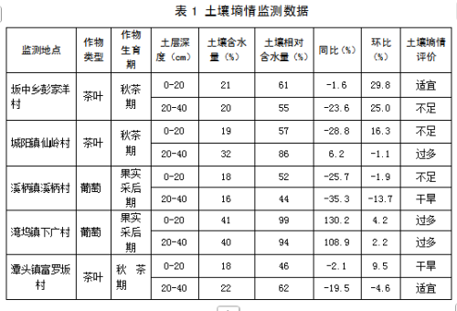 监测点种植作物茶叶当前处于秋茶期、葡萄处于果实采后期,监测点土壤0-20cm含水量平均为23%,相对含水量平均为63%,环比上升10.5%;监测点土壤20-40cm含水量平均为26%,相对含水量平均为68%,环比持平。