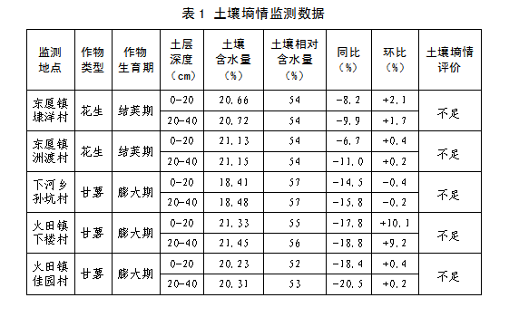 本次监测地块作物花生、甘薯,其监测结果平均为:0-20cm土壤含水量为20.35%,相对含水量为54.4%,同比下降13.12%,环比上升2.53%;20-40cm土壤含水量为20.42%,相对含水量为54.6%,同比下降15.21%,环比上升2.22%。