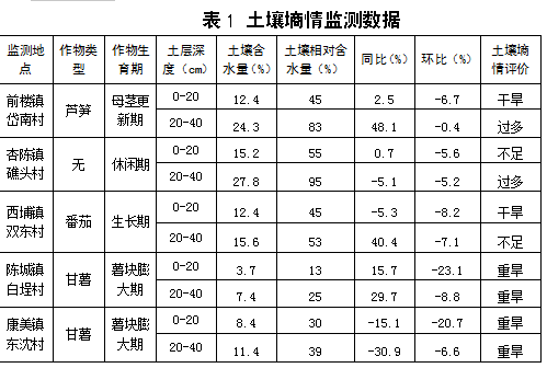 全县5个监测点平均结果为:0-20cm土壤含水量平均为10.4%,相对含水量平均为37.5%,环比下降10.5%,同比上升22.5%;20-40cm土壤含水量平均为17.3%,相对含水量平均为58.8%,环比下降4.9%,同比上升48.1%。