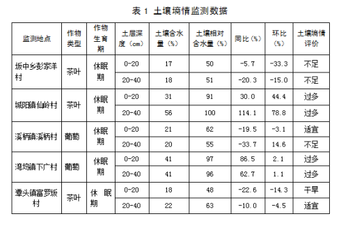 监测点种植作物茶叶当前处于休眠期、葡萄处于休眠期,监测点土壤0-20cm含水量平均为26%,相对含水量平均为70%,环比下降1.4%;监测点土壤20-40cm含水量平均为31%,相对含水量平均为83%,环比上升16.9%。