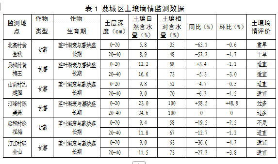 据11月25日荔城区北高镇吴城、后积、山前、北高、汀峰和汀江6个农田监测点土壤墒情监测结果,0-20cm土壤平均自然含水量为11.5%,平均相对含水量为62.7%,同比增加0.2%,环比增加6.7%;20―40cm土壤平均自然含水量为15.4%,平均相对含水量71.8%,同比减少14.3%,环比减少1.9%,具体数据详见表1。荔城区旱地农田土壤0-20cm墒情适宜。