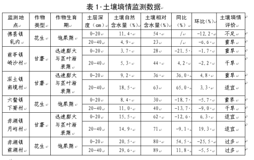 本监测周期为2025年11月26日至2025年12月10日,期间部分地区有小雨。据12月10日对佛昙镇轧内村、前亭镇崎沙村、深土镇南境村、六鳌镇下寮村、赤湖镇月屿村、赤湖镇前湖村等6个农田监测点土壤的墒情监测,漳浦县农田土壤墒情处于干旱水平,具体数据详见表1。