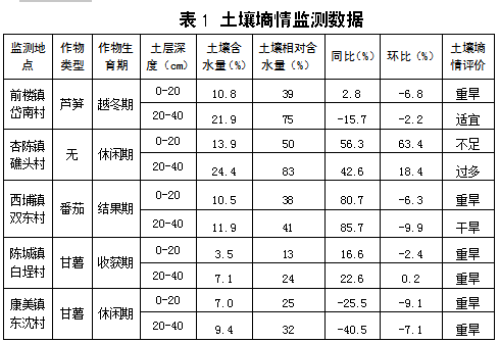 全县5个监测点平均结果为:0-20cm土壤含水量平均为9.1%,相对含水量平均为32.9%,环比上升7.5%,同比上升21.8%;20-40cm土壤含水量平均为14.9%,相对含水量平均为50.8%,环比上升1.8%,同比上升5.0%。