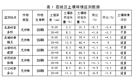 据1月11日荔城区北高镇吴城、后积、山前、北高、和汀江5个农田监测点土壤墒情监测结果,0-20cm土壤平均自然含水量为9.0%,平均相对含水量为53.5%,同比增加4.5% ,环比减少1.1%;20―40cm土壤平均自然含水量为10.9%,平均相对含水量62.8%,同比减少6.2%,环比减少1.6% ,具体数据详见表1,荔城区旱地农田土壤0-20cm墒情不足。