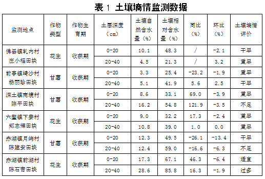 当前,漳浦县花生、甘薯均处于收获期。监测点土壤0-20cm自然含水量平均为10.1%,相对含水量平均为42.6%,同比增加10.9%,环比减少6.1%;监测点土壤20-40cm自然含水量平均为12.9%,相对含水量平均为50.3%,同比增加17.4%,环比减少2.1%。