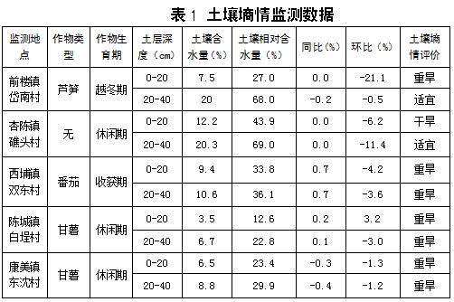 全县5个监测点平均结果为:0-20cm土壤含水量平均为7.8%,相对含水量平均为28.1%,环比下降7.5%,同比上升4.0%;20-40cm土壤含水量平均为13.3%,相对含水量平均为45.2%,环比下降4.8%,同比上升7.2%。