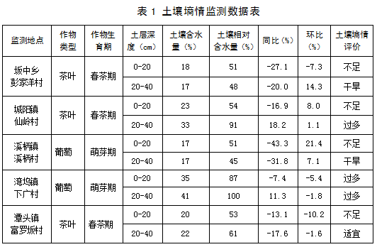 监测点种植作物茶叶当前处于春茶期、葡萄处于萌芽期,监测点土壤0-20cm含水量平均为23%,相对含水量平均为59%,环比下降2%;监测点土壤20-40cm含水量平均为26%,相对含水量平均为71%,环比上升3%。