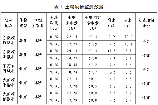 本次监测地块作物花生、甘薯,其监测结果平均为:0-20cm土壤含水量为22.25%,相对含水量为59.35%,同比下降2.24%,环比下降7.7%;20-40cm土壤含水量为22.41%,相对含水量为59.77%,同比下降4.38%,环比下降7.64%。