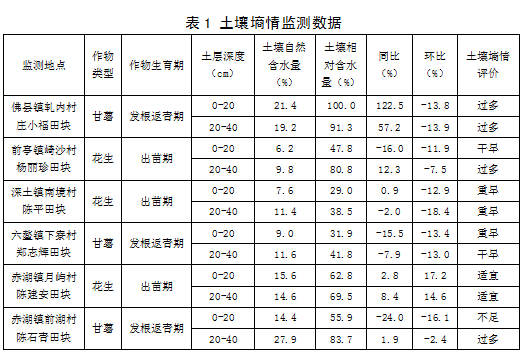 当前,漳浦县甘薯处于发根返青期,花生处于出苗期。监测点土壤0-20cm自然含水量平均为12.4%,相对含水量平均为54.6%,同比增加7.1%,环比减少8.9%;监测点土壤20-40cm自然含水量平均为15.7%,相对含水量平均为67.6%,同比增加9.8%,环比减少6.9%。