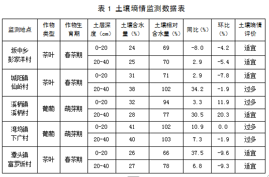 监测点种植作物茶叶当前处于春茶期、葡萄处于萌芽期,监测点土壤0-20cm含水量平均为31%,相对含水量平均为80%,环比下降2.5%;监测点土壤20-40cm含水量平均为32%,相对含水量平均为86%,环比下降1%。