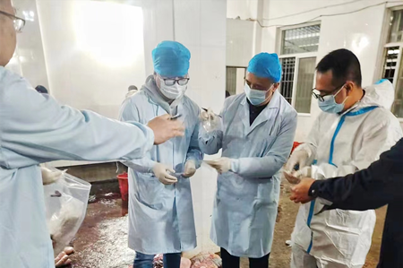 赵思俊、张衍海一行深入连城更旺生态养殖有限公司(生猪养殖场)、连城县晟达生物科技有限公司(无害化处理厂)、连城县莲峰生猪定点屠宰场(屠宰场)、连城县西门市场(农贸市场)进行现场采样。本次共采集生猪耳尖、鼻肛拭子、血液、组织以及环境样品等共计214份。