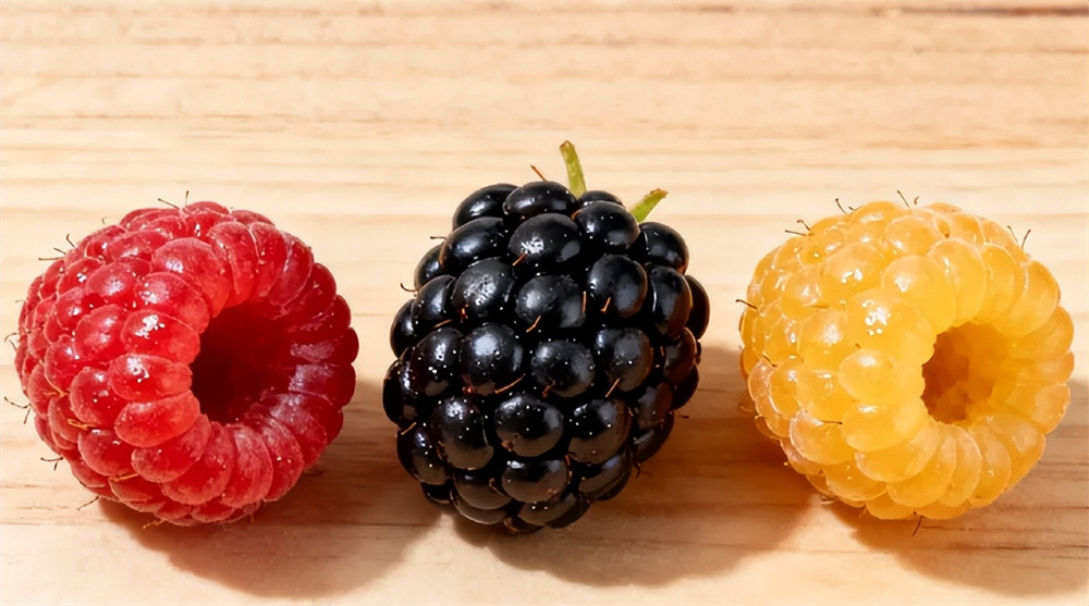 除了红色,树莓还有黄色、黑色、紫色等其他不同颜色。(黑色的树莓叫黑树莓,不是黑莓,黑莓是另一种浆果)