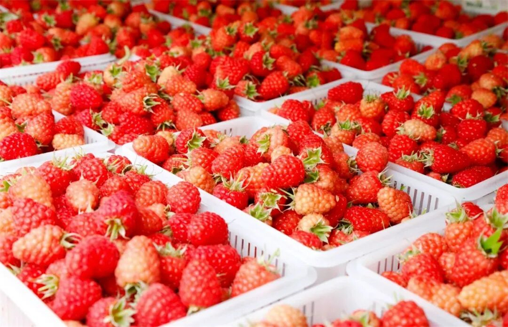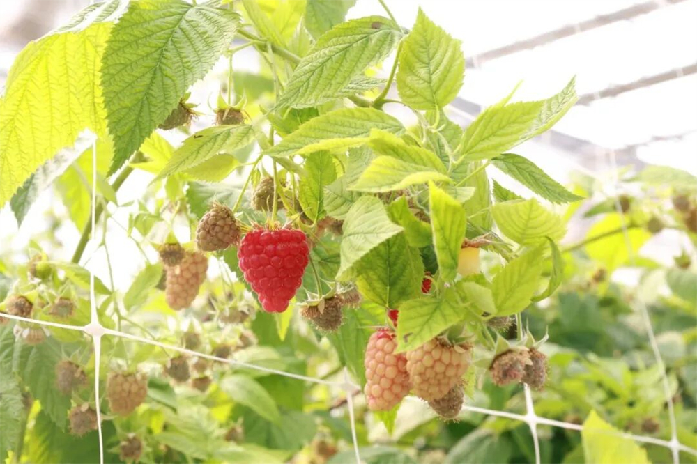 一行行碧绿的藤蔓间,一颗颗红宝石般的树莓,农户们忙碌采摘的身影穿梭其中,为这座现代化温室增添了无限生机与活力。
