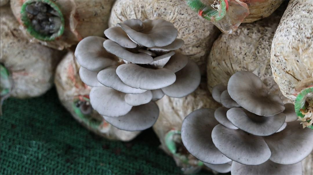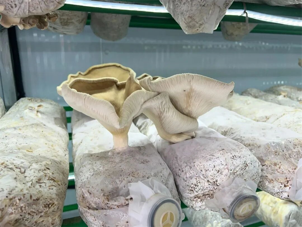 智能化菌菇大棚基地内,只见一排排钢架林立,菌包层层叠叠,朵朵菌菇如花般绽放,香气扑鼻。