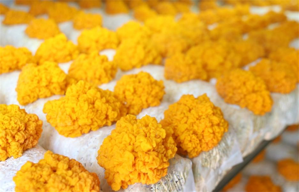 在银川市贺兰县立岗镇金星村,两座白色“集装箱”式菇房内,一排排菌包整齐排列,一颗颗金灿灿的“花朵”在菌包上静静绽放。
