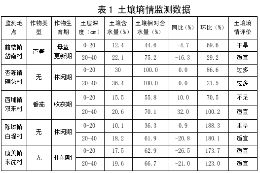 本监测周期为2026年2月27日至2026年3月11日,本监测周期以阴雨天气为主(降雨量93mm)。据3月11日对前楼镇岱南村、杏陈镇礁头村、西埔镇双东村、陈城镇白埕村和康美镇东沈村等5个农田监测点土壤墒情监测,东山县农田土壤墒情处于适宜水平,具体数据详见表1。