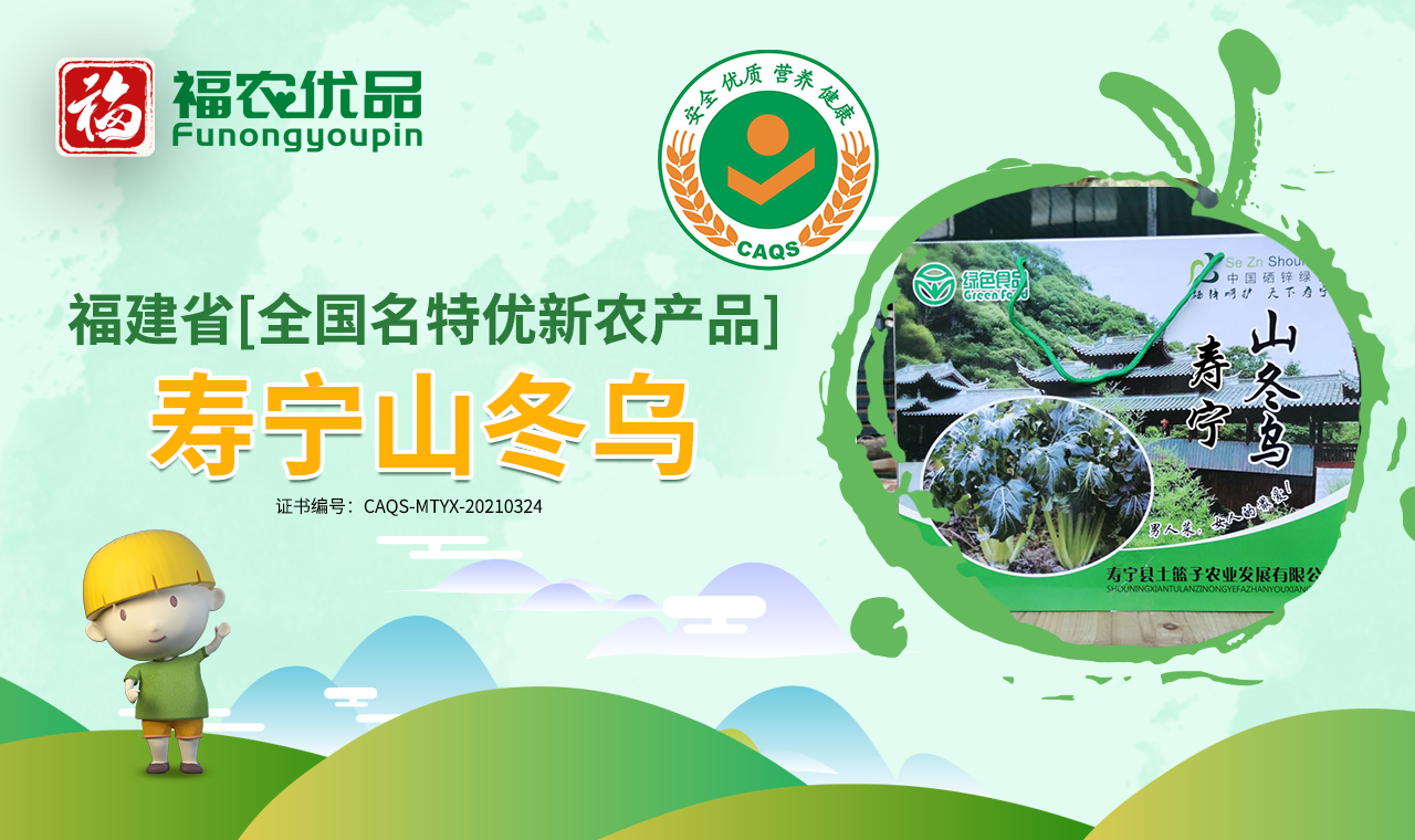 寿宁山冬乌,全国名特优新农产品。寿宁山冬乌又名寿宁青,浓香脆嫩,营养丰富,荣获“中国绿色食品认证”、“中国硒锌绿谷”等荣誉称号,被列入“福建省特色优质农产品”名录。